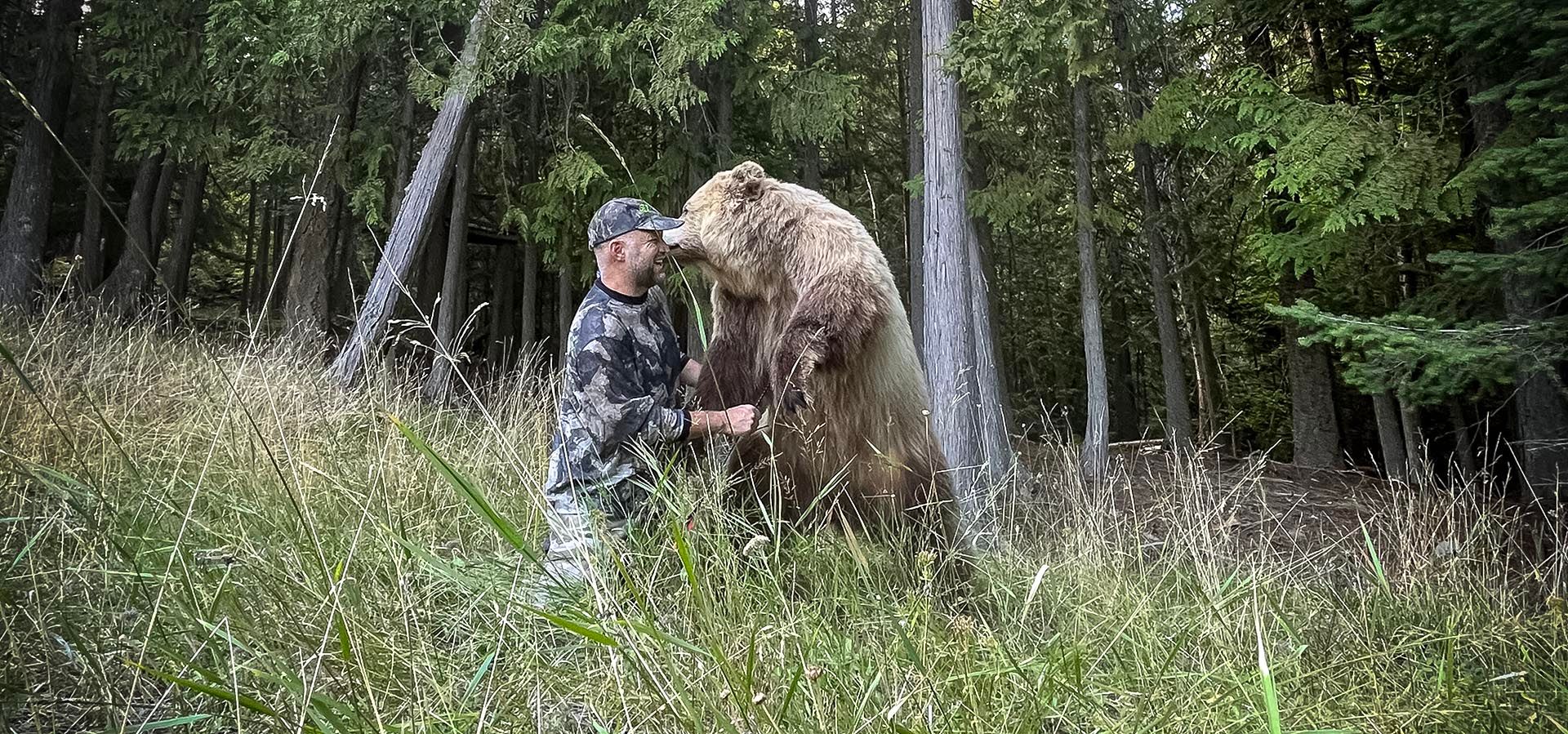 Chad: „Mein Glück war, dass ich meinen Bogen mit einem Pfeil auf der Sehne in meiner linken Hand hielt und die Bärin kommen sah. Leider schaffte ich es nicht mehr, meine Waffe zu spannen, es ging einfach zu schnell. Sie packte mich und schüttelte mich mit aller Kraft. Mir war sofort klar, in welcher schlechten Situation ich mich befand, ich spürte ihre brachiale Kraft, drückte sie weg und stieß mehrfach mit dem Pfeil in ihre Weichteile. Ich stach schnell zu, aber absichtlich nicht tief, da mir klar war, dass ich so meine Pfeilspitze besser einsetzen konnte. Auch war die Gefahr, dass der Pfeil abbrechen würde – wie bei einem tiefen Stich bis zur Mitte des Schaftes – nicht so hoch. Mein Plan ging auf, sie ließ von mir ab und verschwand mit ihren Jungen. Da...